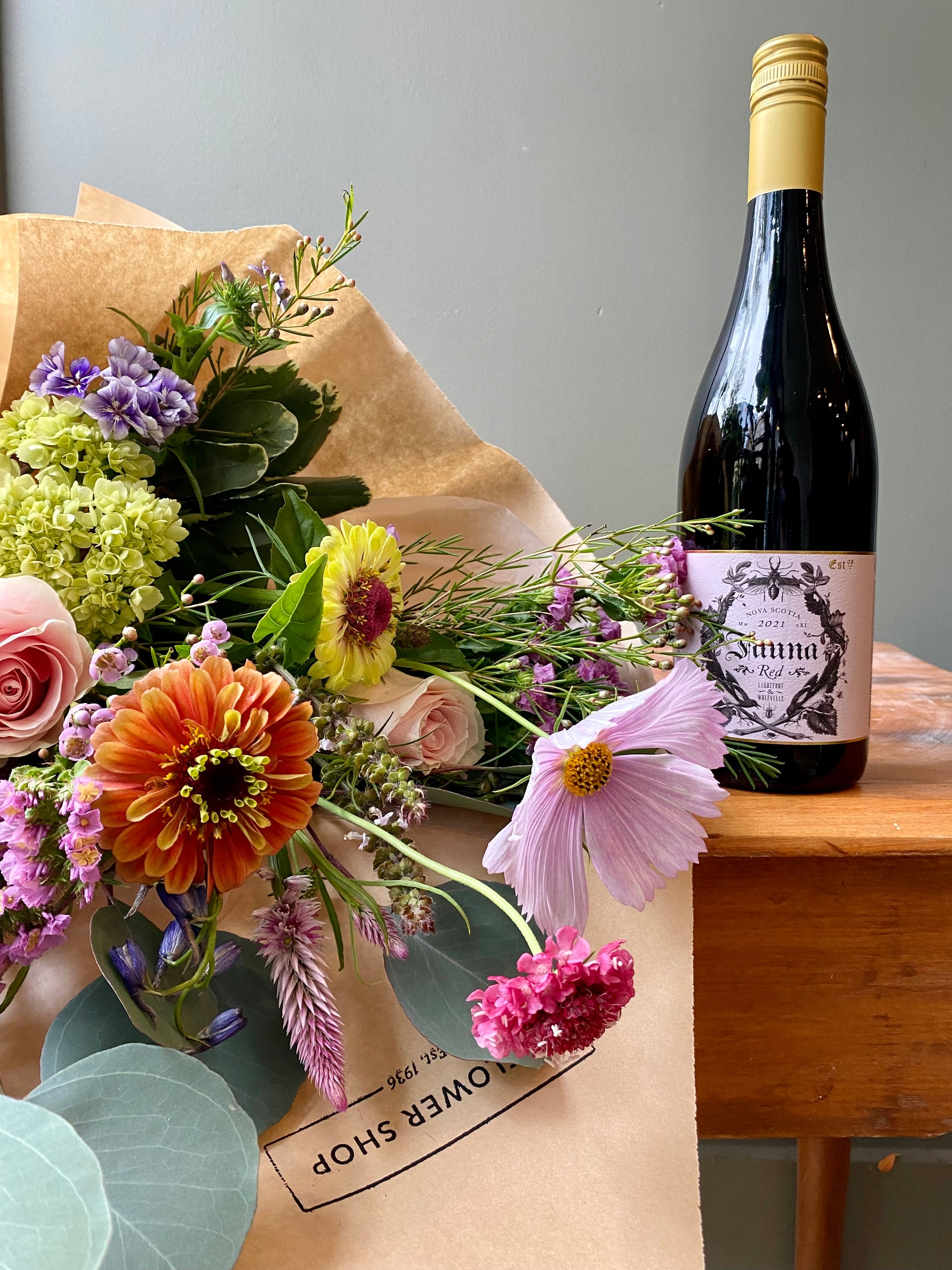 Enhance your gift giving with our bouquet and wine package! Featuring fresh, seasonal flowers and your choice of white or red local wine.